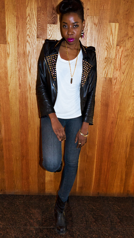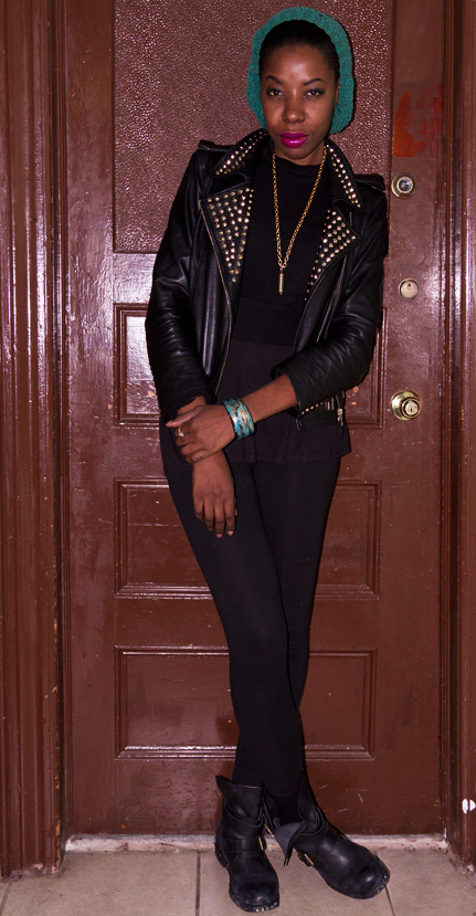 Thursdays I have class at 9am, so I literally have to throw something on to still not make it on time. I put on a basic knit black dress…throw on the moto jacket and suddenly it looks like I took more than 2 minutes to get dressed. I actually had to put on the belt on the train; that’s how fast I got dressed.