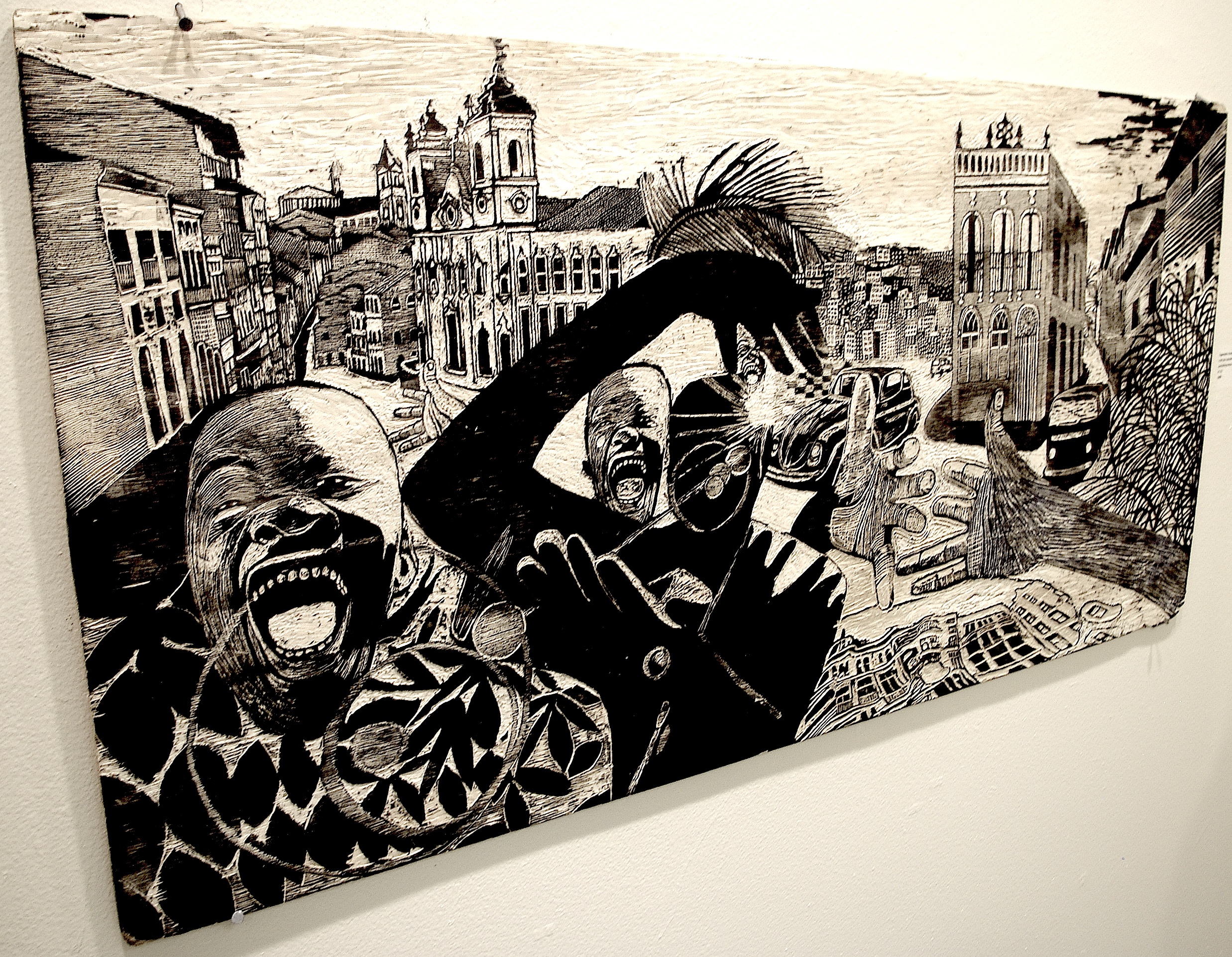 Above is my favorite piece, Everything of Nothing & Nothing of Everything When I Talk to You; the picture gives the tangible version no justice.  This is a slab of wood, where the picture is etched in, not painted on.  The way that the artist, Taganyahu Swaby, is able to create depth is amazing, it’s the minutia that brings everything together and makes the piece so sick!  Go check it out in person.