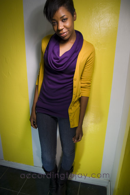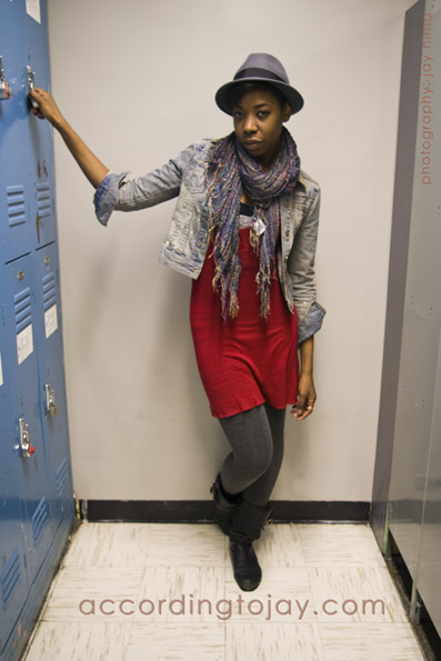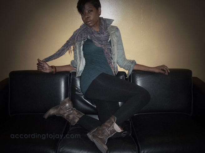 This week my favorite picture was Thursday.  In the Style Diary it seems like I rarely smile, but I actually do, so I thought the picture caught a great moment.  Thursday may also be my favorite outfit, I love the teal corduroys and the printed top. But I have to go with Saturday, my denim jacket has been my go-to item, and I’m definitely feeling the maroon tights; I need to add colored tights to my wardrobe stat!